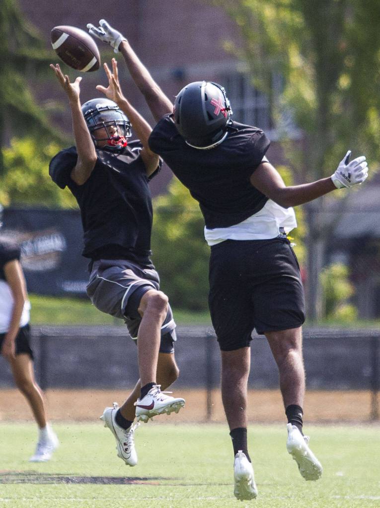 Archbishop Murphy’s Jaceer Brooks makes a catch during practice on Thursday, Aug. 24, 2023 in Everett, Washington. (Olivia Vanni / The Herald)