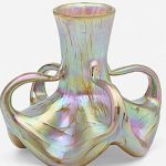 Loetz received patents for iridescent glass in 1895 and 1896, shortly after Tiffany launched the fashion with its famous Favrile glass. Loetz produced several lines of iridescent glass, and Phanomen was its triumph, winning a Grand Prix award at the Paris Universal Exposition in 1900. It combines the beauty of iridescence with the technical expertise required to create its organic shapes and silvery pulled threads.