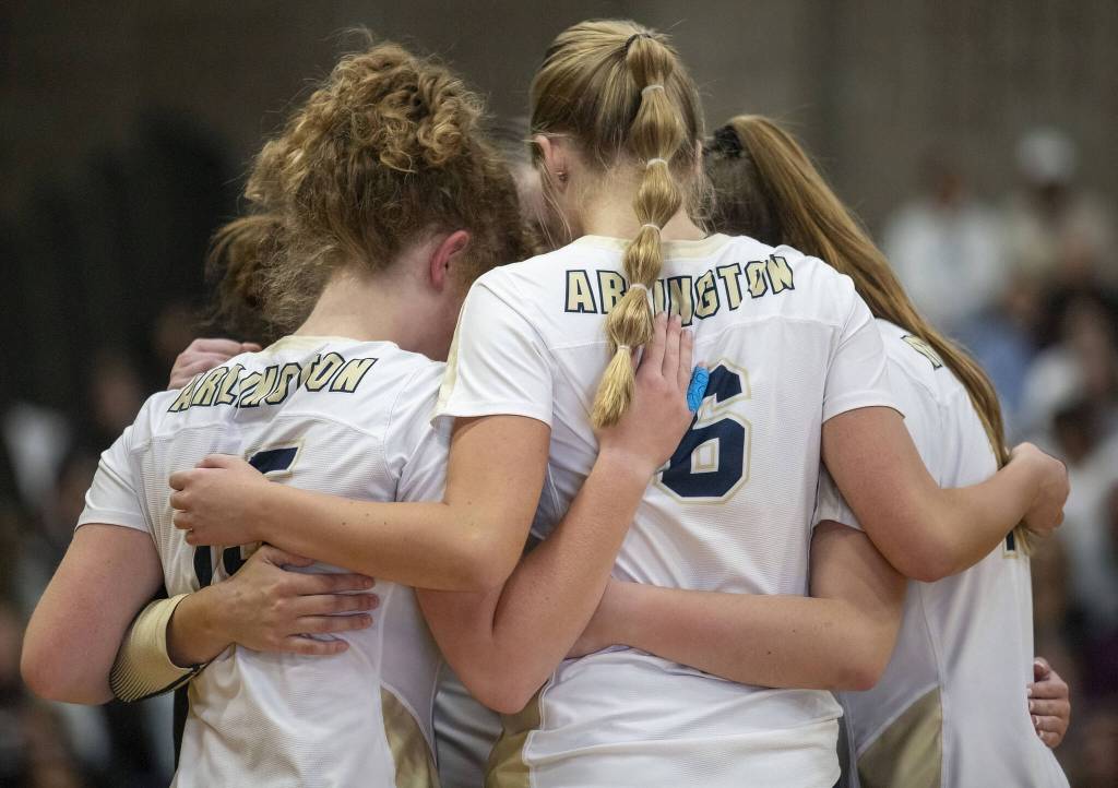 Arlington players gather in a huddle before the start of the game against Stanwood on Tuesday, Sept. 19, 2023 in Arlington, Washington. (Olivia Vanni / The Herald)