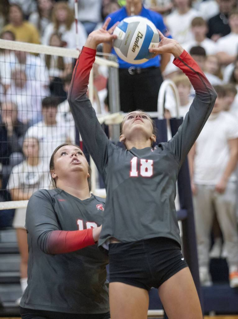 Stanwood’s Eliot McDonald sets the ball during the game against Arlington on Tuesday, Sept. 19, 2023 in Arlington, Washington. (Olivia Vanni / The Herald)