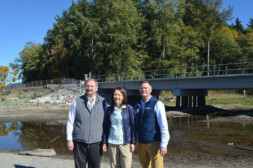 Snohomish County Executive Dave Somers (right), U.S. Sen. Maria Cantwell and Snohomish County Conservation and Natural Resources Director Tom Teigen stand in front of the new Meadowdale Park estuary project on Oct. 6, 2023. (Jordan Hansen / The Herald)