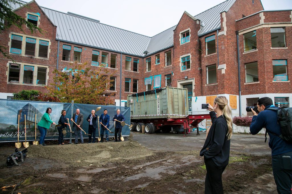 A group including Everett Mayor Cassie Franklin, Compass Health CEO Tom Sebastian, Sen. Keith Wagoner and Rep. Julio Cortes take their turn breaking ground during a ceremony celebrating phase two of Compass Health’s Broadway Campus Redevelopment project Thursday, Oct. 12, 2023, in Everett, Washington. (Ryan Berry / The Herald)