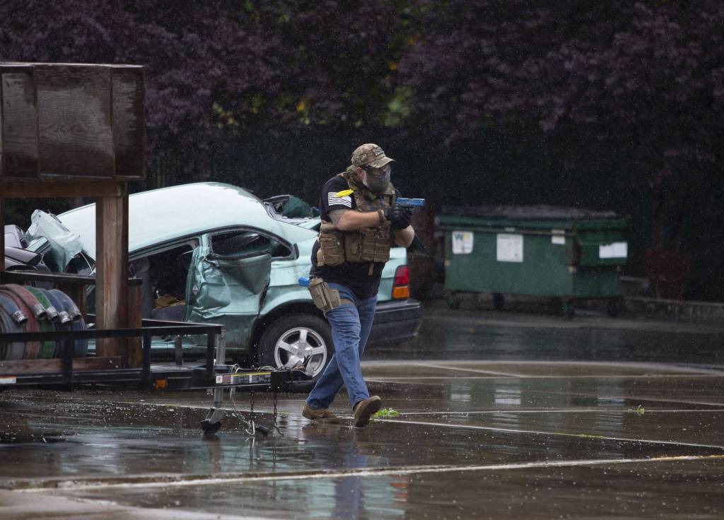 Andrew Sunagel acts as the “active shooter” during a mass casualty training on Wednesday, Oct. 11, 2023 in Snohomish, Washington. (Olivia Vanni / The Herald)