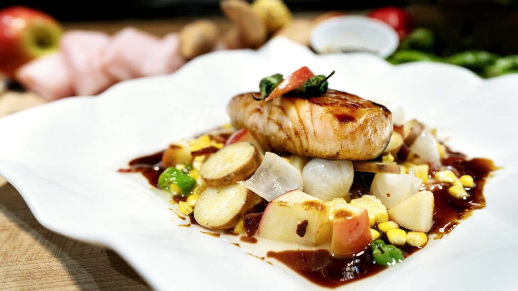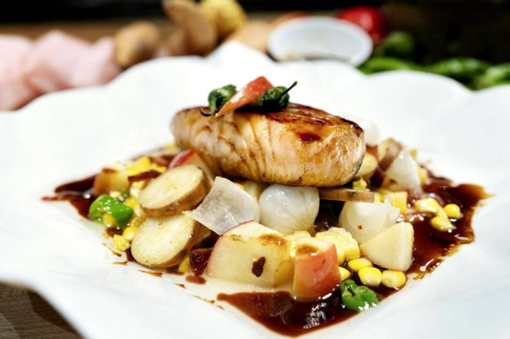 I’m taking this culinary jewel of the sea and glazing it with a honey-soybean fermented miso paste. In this recipe, we place the sweet, glazed cod atop a non-traditional, Native American-inspired succotash. While traditional succotash contains lima beans and corn, my version eliminates the lima beans and spices up the corn a bit with mild padron peppers, Washington state apples, bacon and cippolini onions. You’re not limited to black cod. Feel free to use any seafood (such as halibut) that you have available to create this mouthwatering dish.