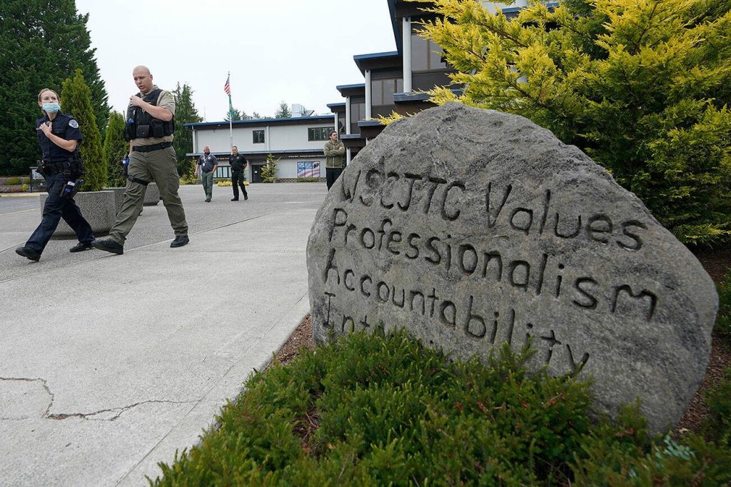 Cadets LeAnne Cone, left, of the Vancouver Police Dept., and Kevin Burton-Crow, right, of the Thurston Co. Sheriff’s Dept., walk past a rock at the Washington state Criminal Justice Training Commission engraved with “WSCJTC Values Professionalism, Accountability Integrity,” on the way to a training exercise Wednesday, July 14, 2021, in Burien, Washington. (AP Photo/Ted S. Warren)