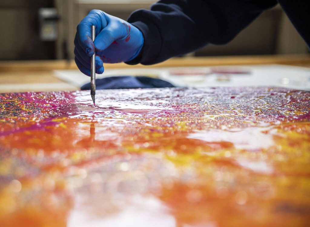 About 10 people watched as the brawny man with a bushy handlebar mustache pulled down the cloth to unveil his latest painting, an abstraction of a circle surrounded by orange transitioning to blue and black titled “A Sunny Day in Everett.”