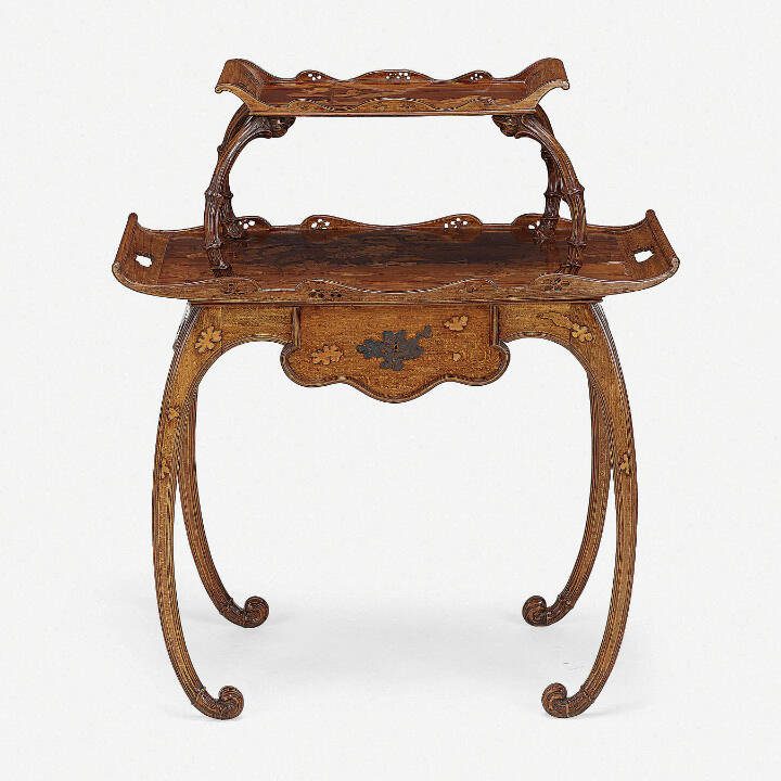 Emile Galle, a pioneer of the art nouveau movement that started in the 19th century, is famous for his glass, ceramics and furniture. He is best known for the cameo glass made by the studio he founded in Nancy, France, in 1873. His glass had the graceful curving shapes, Japanese influence and natural elements like flowers and plants that characterize art nouveau. So did his furniture. This tea table by Galle, with scrolling legs, scalloped edges and inlaid cherry blossoms, sold for $2,800 at a Rago auction.