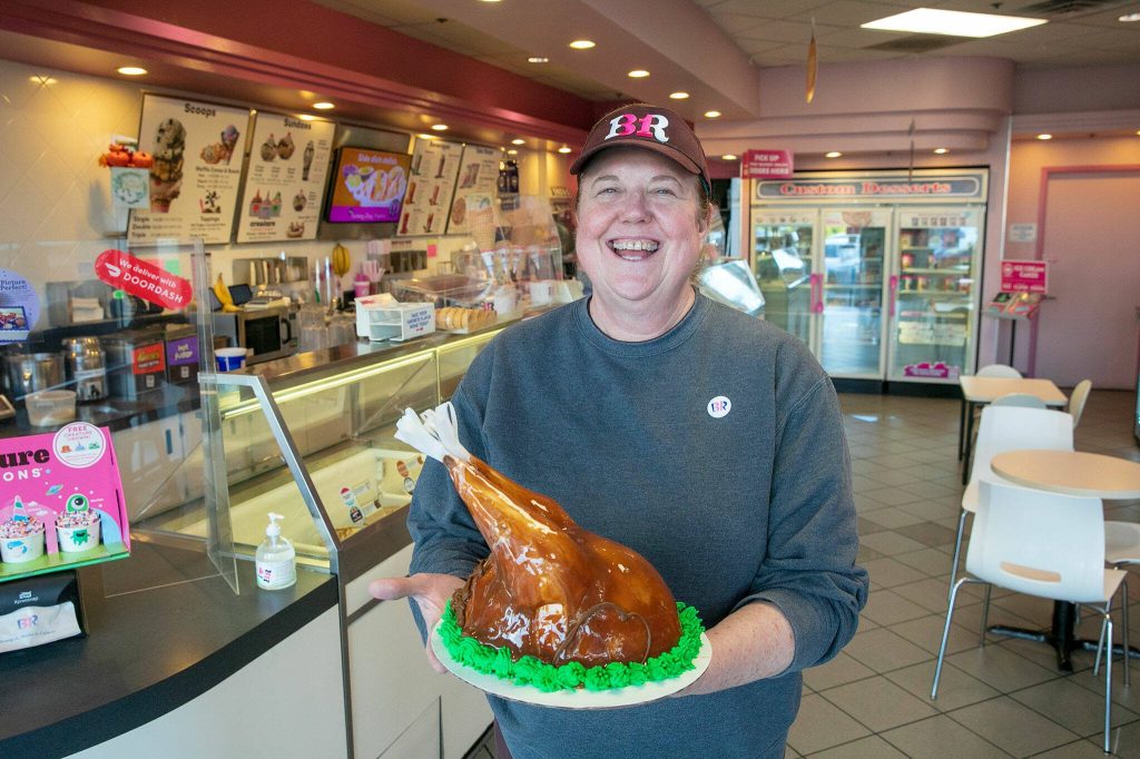 “The Turkey Cake has been around for 40-some years, but is creating a buzz this year,” said Cindy Buchan, owner of the Baskin-Robbins at 530 SW Everett Mall Way.
