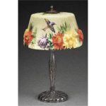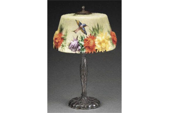The early 20th century saw the appearance of beautiful, elaborate glass lampshades. The Pairpoint company in New Bedford, Massachusetts, started making lamps in 1890. Their most famous — and most expensive — are their Puffy lamps with three-dimensional designs. This Puffy lamp with three-dimensional flowers and colorful hummingbirds sold for $5,736 at Morphy Auctions.