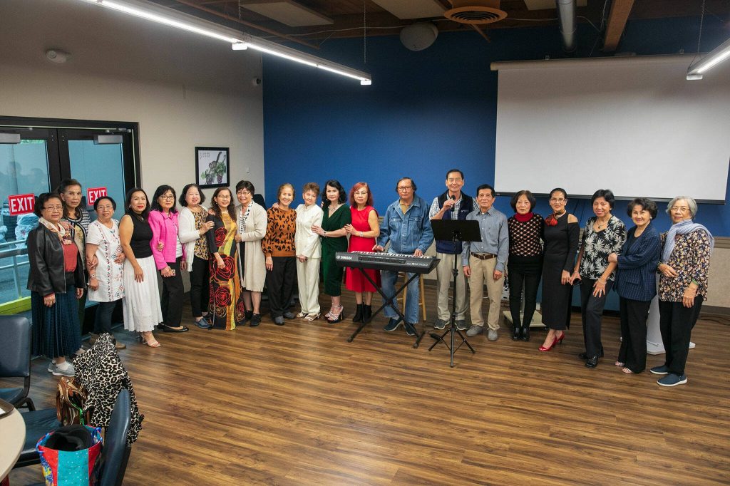 A group of seniors gather together for a group photo at the karaoke stage during a Vietnamese community lunch at the Homage Multicultural Senior Center on Wednesday, Nov. 15, 2023, in Lynnwood, Washington. (Ryan Berry / The Herald)