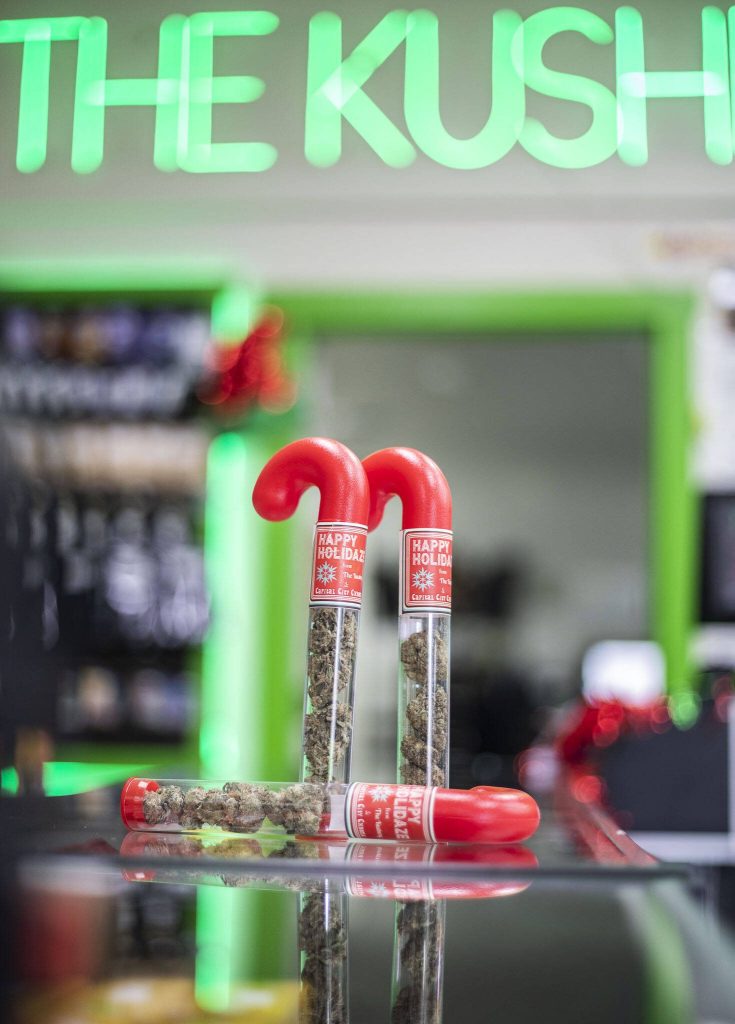 A clear plastic “Happy Holidaze” candy cane tube with 3.5 grams of dried buds, aka flower, is $35.