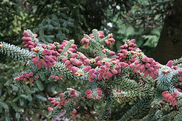 What: Blue Spanish fir is a stately and majestic evergreen that draws attention with its graceful-yet-rigid layered branches, narrow conical shape and unusually stiff, intensely colored powder-blue short needles. The non-prickly needles are arranged radially around the branchlets, which creates an interesting texture and is enticing to the touch. In early spring, the branch tips are covered with surprisingly beautiful, small violet-red pollen cones, which are especially attractive against the blue foliage.