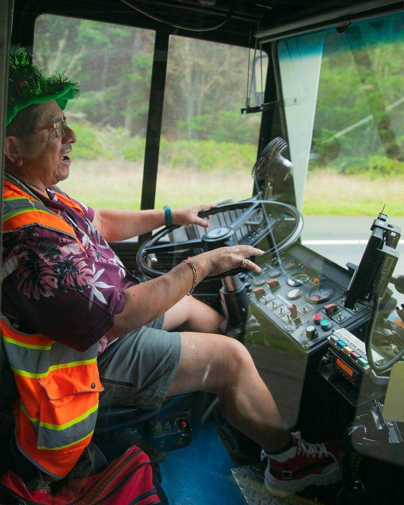 The first thing I learned about Gutierrez was that after 20 years in the U.S. Navy, he’d decided to spend 20 more years driving buses. He has fun with it. He wore a green elf hat and bright red shoes as he drove on this December morning. One passenger later in the day asked to take his photo. He obliged.