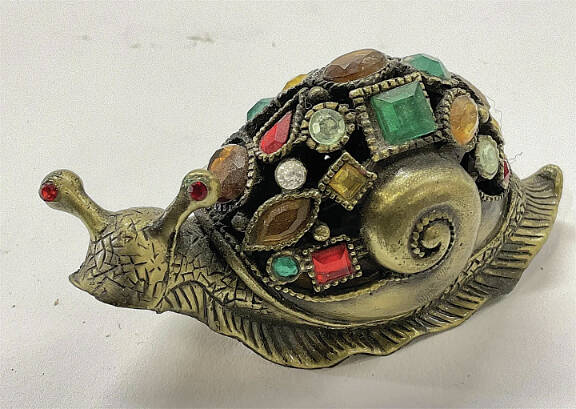 Snails have a lot of negative associations. Their slow movement makes them a symbol of laziness and inefficiency. They are garden pests, eating plants and oozing slime. And yet they often appear in decorative arts, like this miniature brass figure that sold for $51 at an auction by The Benefit Shop Foundations. Its shell is decorated with colorful glass “jewels,” a popular adornment on brass in the Victorian era.