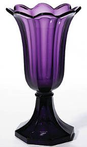 This tulip-shaped amethyst glass vase was made between about 1845 and 1865 by the Boston & Sandwich Glass Company, one of the most important American glass manufacturers. It is pressed glass, which emerged in the 1820s with the invention of the pressing machine.