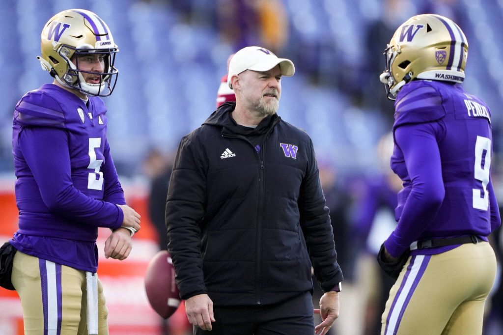 Washington offensive coordinator Ryan Grubb, center, talks with quarterback Dylan Morris (5) and quarterback Michael Penix Jr. (9) as they warm up before an NCAA college football game against Washington State, Saturday, Nov. 25, 2023, in Seattle. (AP Photo/Lindsey Wasson)