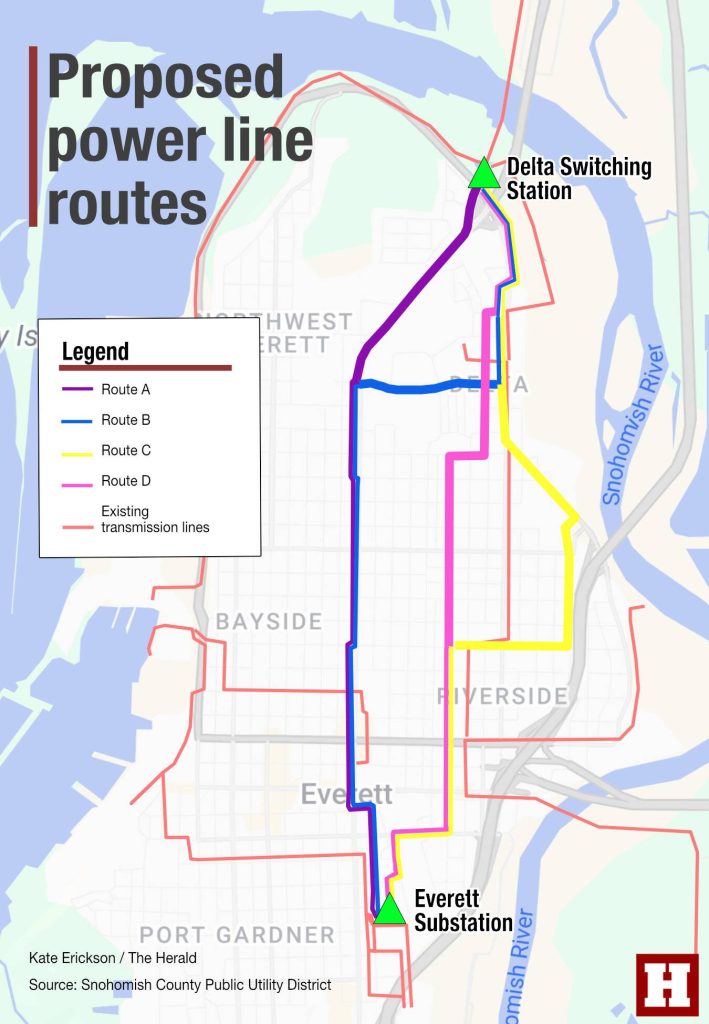 The PUD hosted a public meeting last month to try to explain. The project aims to send lines from the Delta Switching Station at 201 E Marine View Drive to the Everett Substation at 3402 Paine Ave. The neighborhoods east of Broadway have the shortest path between the two points.