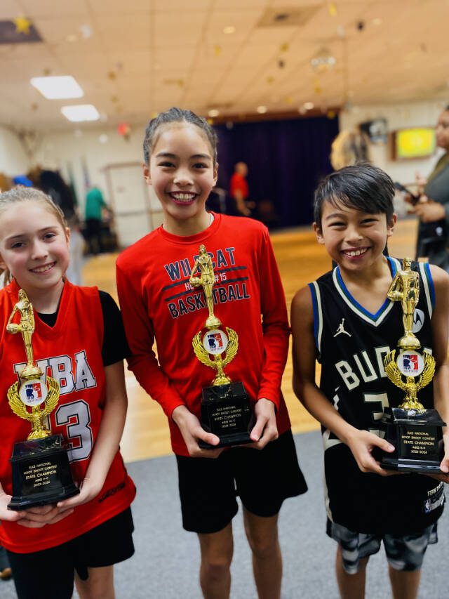 Helaina Soterakopoulos, Ellie Matisin and Max Soterakopoulos each won their division at the Washington State Elks Association Hoop Shoot free-throw competition, which took place Feb. 10 at Saint Martin’s University in Olympia.