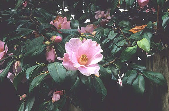 What: In mid-winter, a profusion of large, single pale-pink flowers with prominent central yellow tufts of stamens dot this large, dark evergreen shrub. This is a vigorous grower with upright branches that become gracefully pendulous with age, giving a better view of the flowers at bloom time. As an added bonus, the faded blooms drop, unlike many of the Japanese camellias.