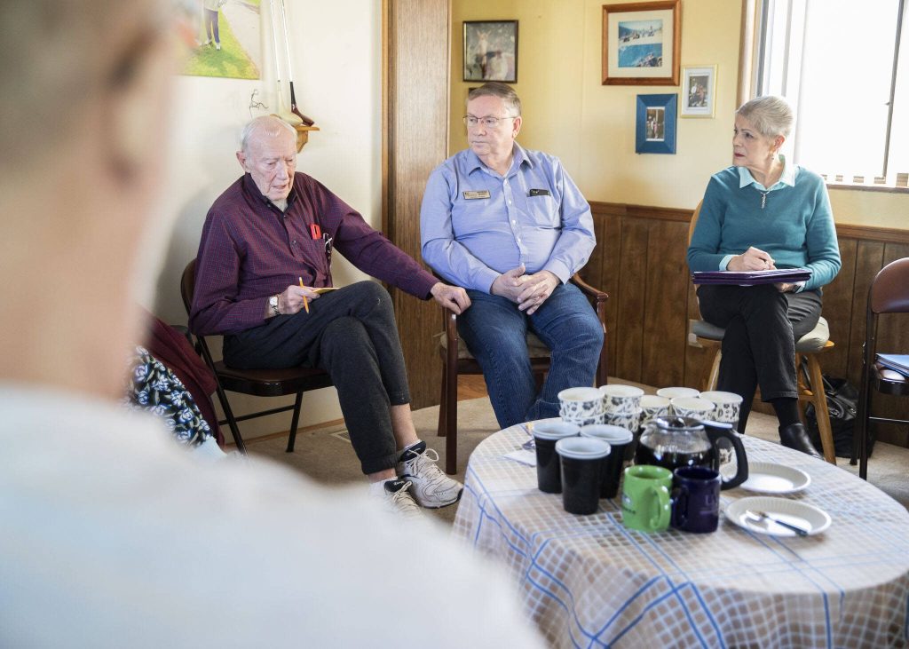 Royalwood Estates Mobile Home Park resident Victor Huff, left, speaks to Lynnwood City Council President George Hurst, center, about his concerns with the mobile home park rent being raised on Tuesday, March 5, 2024 in Lynnwood, Washington. (Olivia Vanni / The Herald)