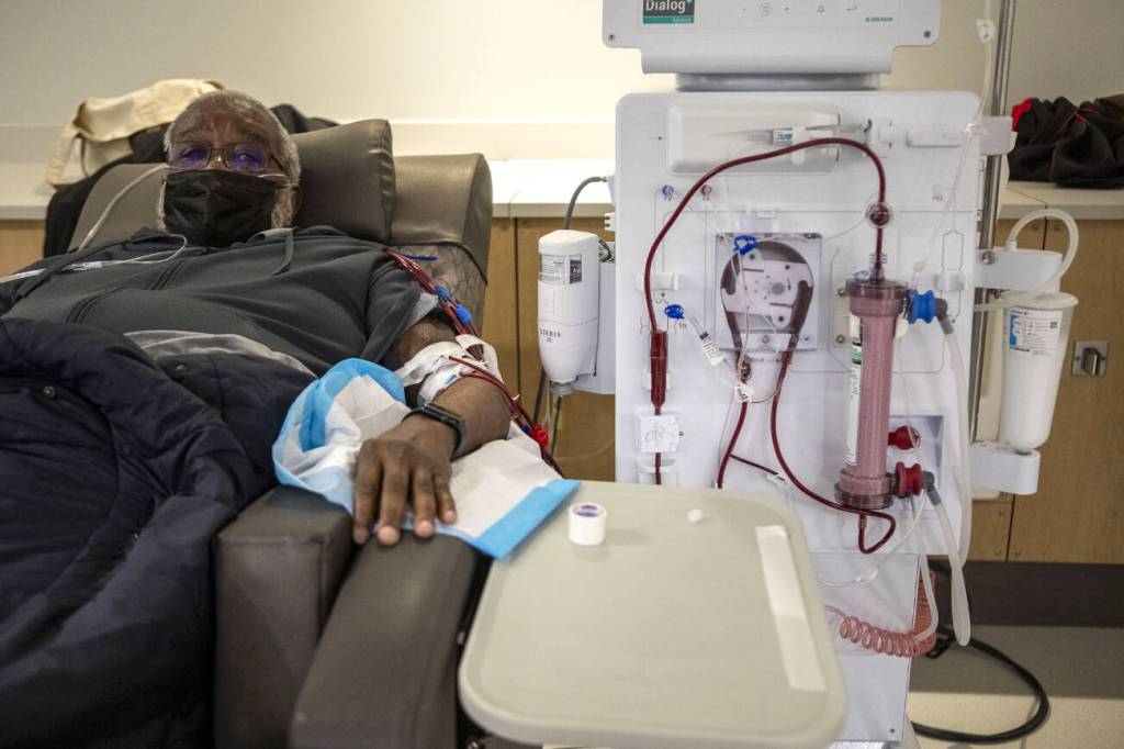 Each week at the Northwest Kidney Centers dialysis clinic in Everett, a machine pumps out and filters Jones’ blood, one cup at a time. The process takes about four hours. Jones is thankful for his family, who drive him to the clinic and care for him when he needs rest at home.