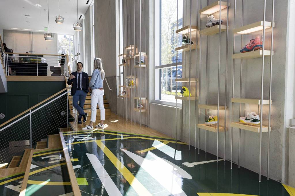There are small examples throughout of what Brummel was saying. The primary gathering space in the building has tiered seating made from the court when Seattle won the WNBA title in 2018. There’s a sneaker wall featuring shoe designs Seattle players have worn through the years. The main entrance has all four of the championship trophies on display. A mural on one wall of the main practice floor features the Seattle skyline with the outline of the mountains in the background.