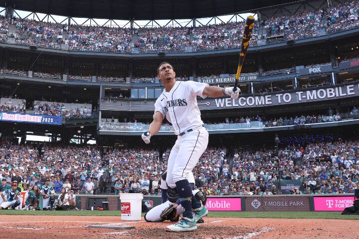 Julio Rodríguez (44) of the Seattle Mariners reacts during the T-Mobile Home Run Derby at T-Mobile Park on July 10, 2023, in Seattle, Washington. (Steph Chambers/Getty Images/TNS)