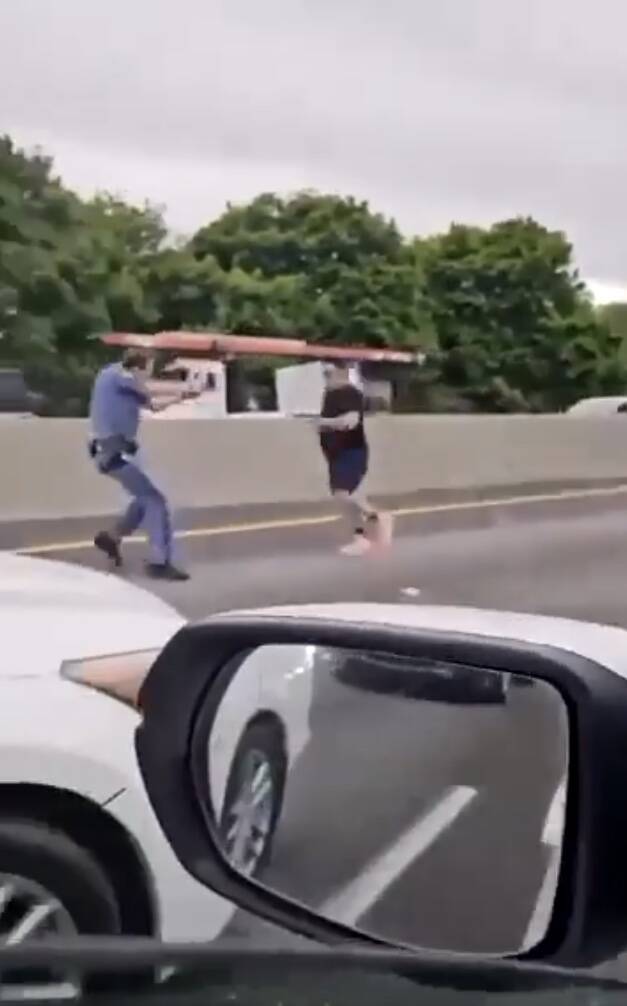 Taken from the driver’s side window, the new video shows a man in black shorts walking up to a lone trooper on the shoulder of the freeway, yelling.