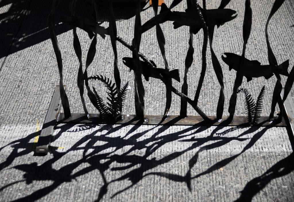 A salmon metal work is available at Forgeress Ironworks during Sorticulture on Friday, June 7, 2024, in Everett, Washington. (Olivia Vanni / The Herald)
