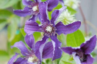 What: A profusion of royal purple flowers burst forth in early summer and continue for weeks. This non-vining clematis is more perennial-like, growing to only 3 or 4 feet annually and then dying back to the base in the winter. SAPHYRA INDIGO™ is attractive supported by a shrub or sturdy perennial, growing through a wire or wooden structure, in a container or rambling along the ground among low-growing companions.
