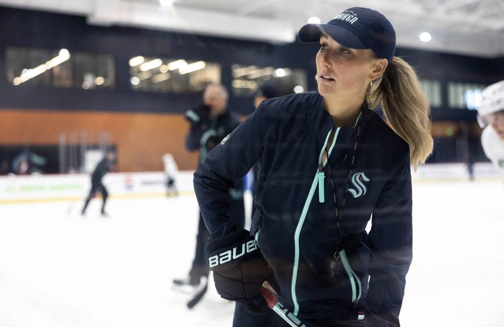 She landed the Coachella Valley gig later that summer as the first female assistant coach in AHL history. Last September, while helping coach at the Kraken’s training camp, she went behind their bench for a preseason game against Calgary at Climate Pledge Arena.