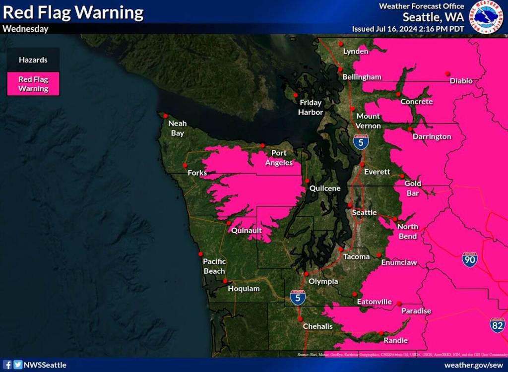 EVERETT — The National Weather Service issued a red flag warning on Wednesday for the majority of the Cascade Range and Olympic Mountains.