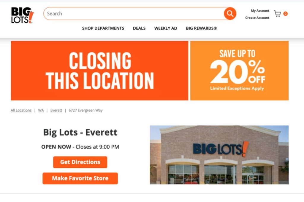 The Big Lots at 6727 Evergreen Way in Everett and the Big Lots at 5710 196th St SW in Lynnwood are closing, according to each of the stores’ websites.