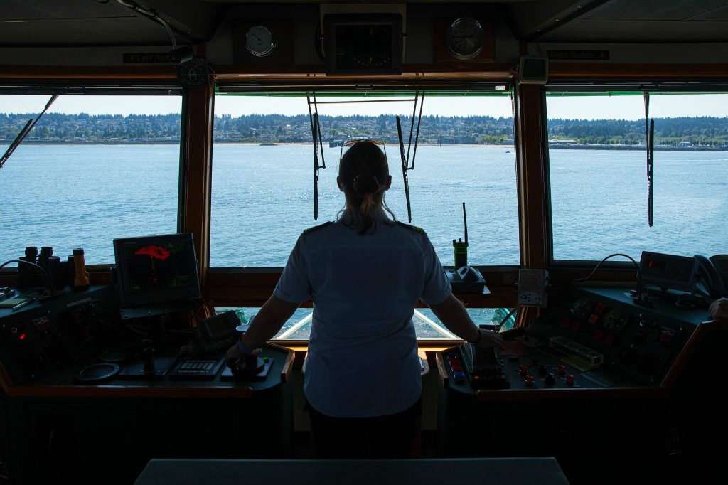 Sporting his white uniform featuring four gold stripes on a black epaulet, he peers out the tall windows of the ferry’s bridge. A 31-year ferry system veteran, he is in charge of ensuring the boat reaches its destination safely.