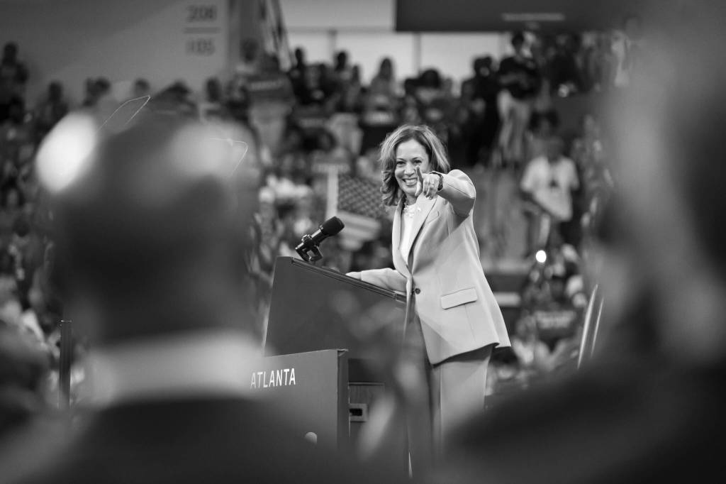 Vice President Kamala Harris, the presumptive Democratic nominee for president, points out Sen. Raphael Warnock (D-Ga.) during a campaign rally in Atlanta on Tuesday, July 30, 2024. Harris’s ascent has delivering an electric shock to a listless Democratic Party that for more than a year struggled to mobilize its base behind President Joe Biden. (Nicole Craine/The New York Times)