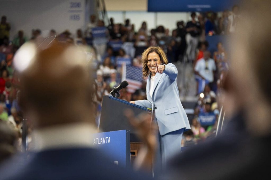 Vice President Kamala Harris, the presumptive Democratic nominee for president, points out Sen. Raphael Warnock, D-Ga., during a campaign rally in Atlanta on Tuesday. Harris’s ascent has delivering an electric shock to a listless Democratic Party that for more than a year struggled to mobilize its base behind President Joe Biden. (Nicole Craine / The New York Times)