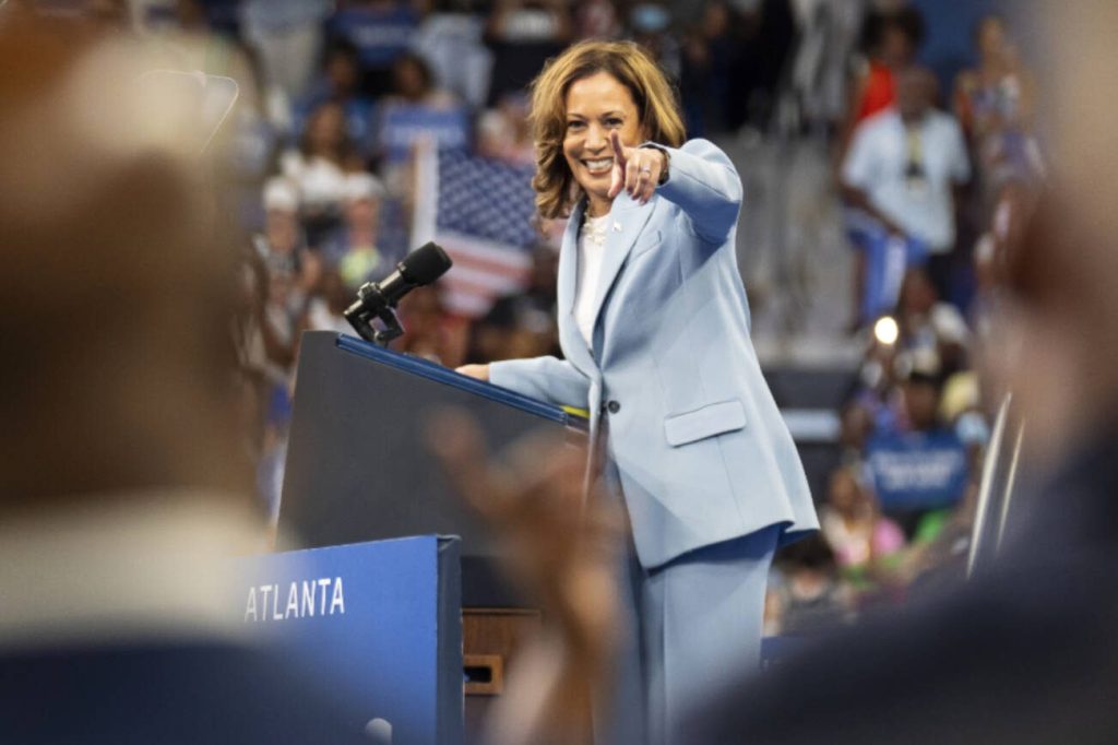 Vice President Kamala Harris, the presumptive Democratic nominee for president, points out Sen. Raphael Warnock, D-Ga., during a campaign rally in Atlanta on Tuesday. Harris’s ascent has delivering an electric shock to a listless Democratic Party that for more than a year struggled to mobilize its base behind President Joe Biden.