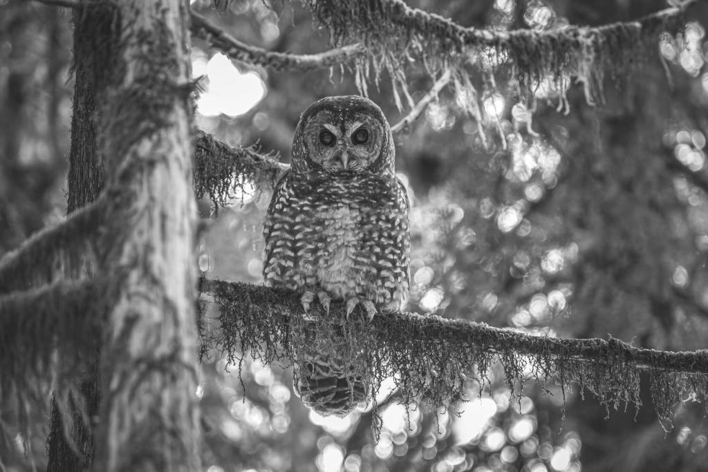 A northern spotted owl in an old growth forest.