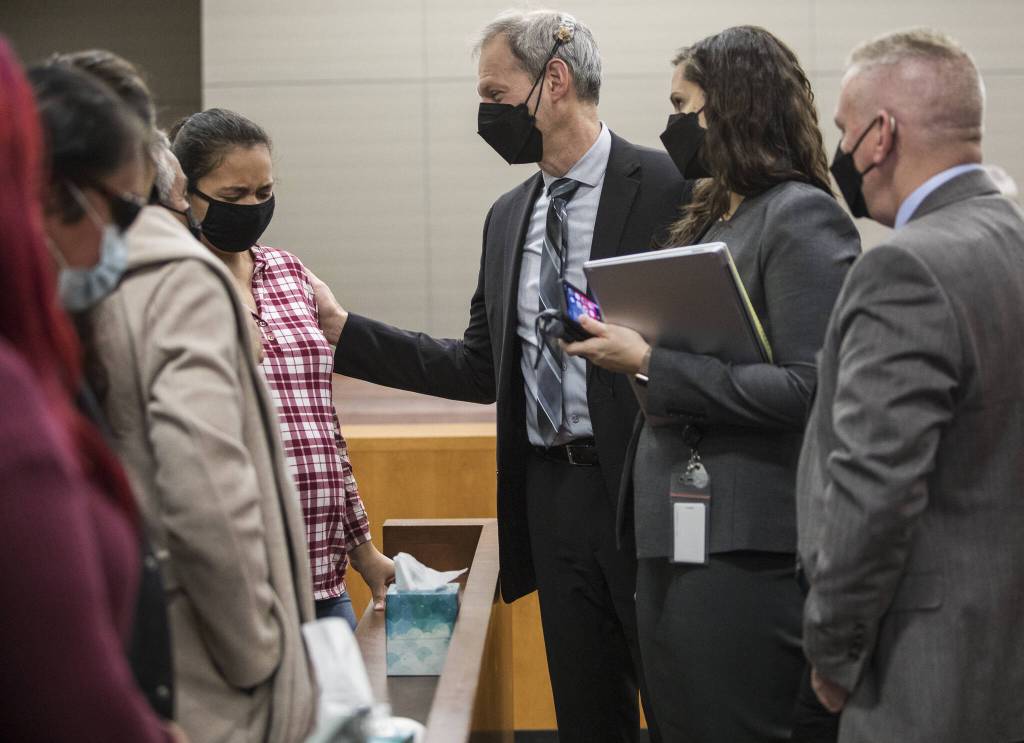 Algeria Canales, the sister of Alisha Canales-McGuire who was murdered by a man hired by Kevin Lewis, becomes emotional while speaking with deputy prosecutor Jarett Goodkin after the jury found Lewis guilty of first degree murder in 2021 in Everett. (Olivia Vanni / The Herald)