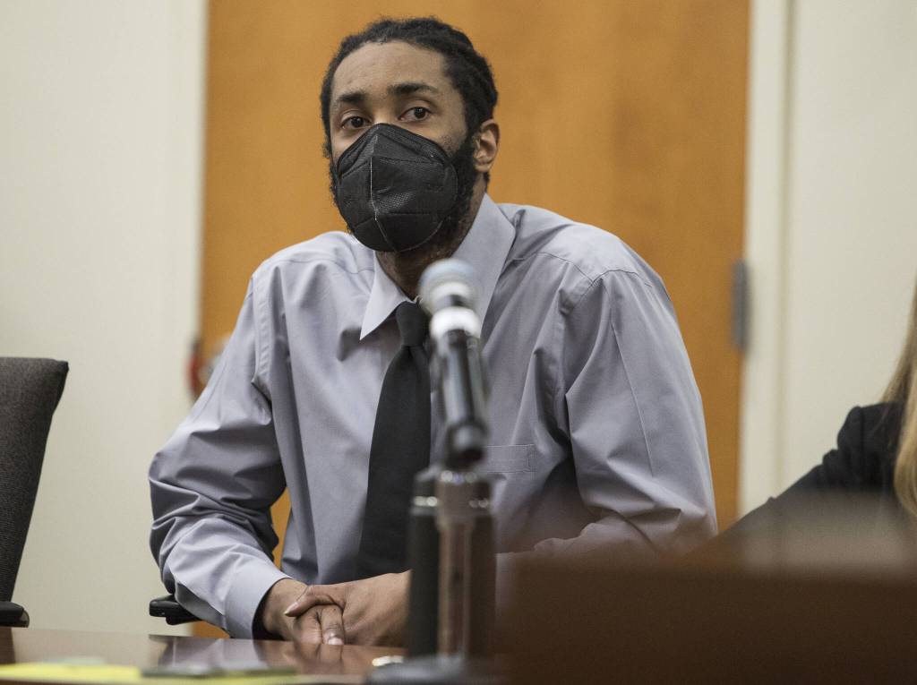 Defendant Kevin Lewis listens while Snohomish County Superior Court Judge Paul Thompson reads a guilty verdict in 2021 in Everett. (Olivia Vanni / The Herald)