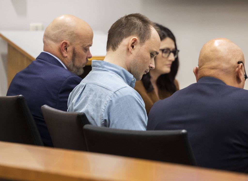 Defense attorneys Laura Shaver and David Roberson represented Sayre in court Tuesday. He appeared in court in a blue button-up and slacks.