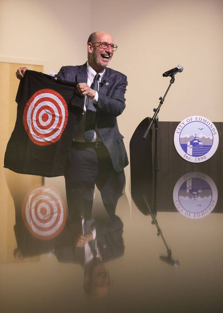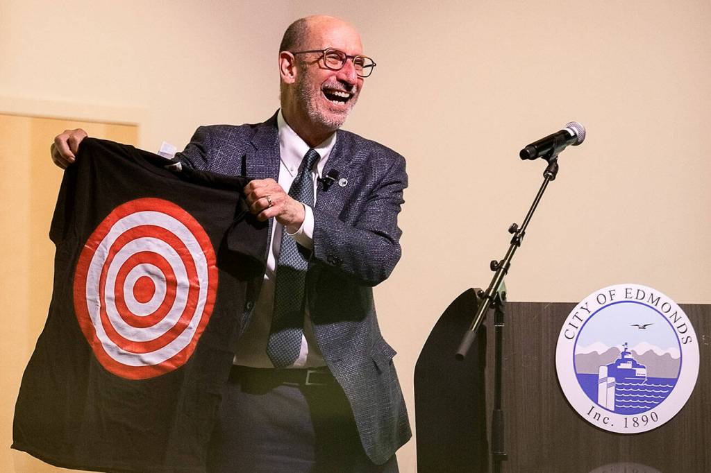Edmonds Mayor Mike Rosen is reflected in a countertop as he pulls out a bullseye shirt at the start of his 2025 budget presentation at the Edmonds Waterfront Center on Tuesday, Oct. 1, 2024 in Edmonds, Washington. (Olivia Vanni / The Herald)