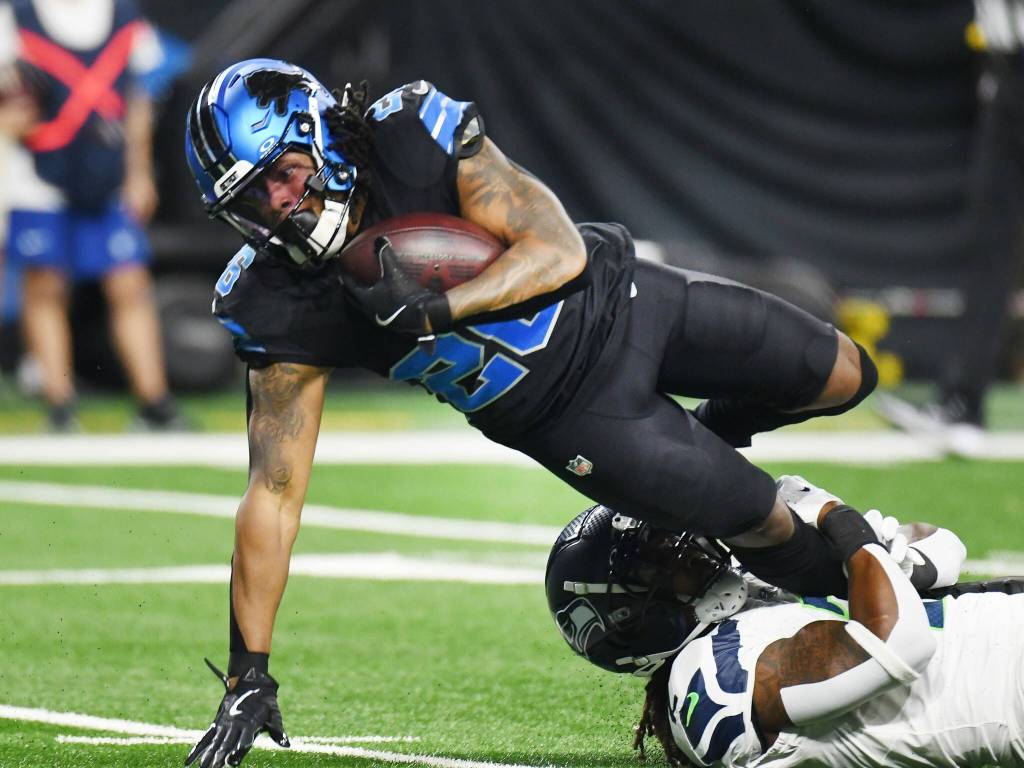 Lions Jahmyr Gibbs stretches out for yardage with Seahawks Rayshawn Jenkins holding on in the first quarter on Sept. 30, 2024. (Daniel Mears / Detroit News / Tribune News Service)