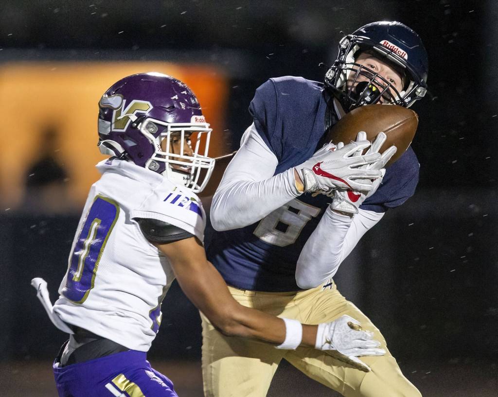 But that’s why the game was decided on the gridiron at John C. Larson Stadium on a chilly, wet and slippery evening. The No. 7 Eagles (8-1 overall, 5-1 league) punished the Vikings (6-3, 5-1) on both sides of the ball, earning a 28-14 victory, which also resulted in a three-way tie with Glacier Peak for the Wesco 4A title. All three teams will host playoff games on Nov. 8 or 9.