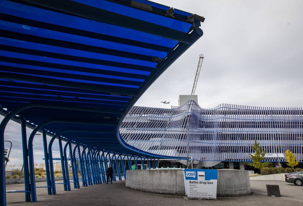 A plane taking off from SeaTac is framed by the Angle Lake station parking garage on Oct. 14, 2024 in SeaTac, Washington. (Olivia Vanni / The Herald)