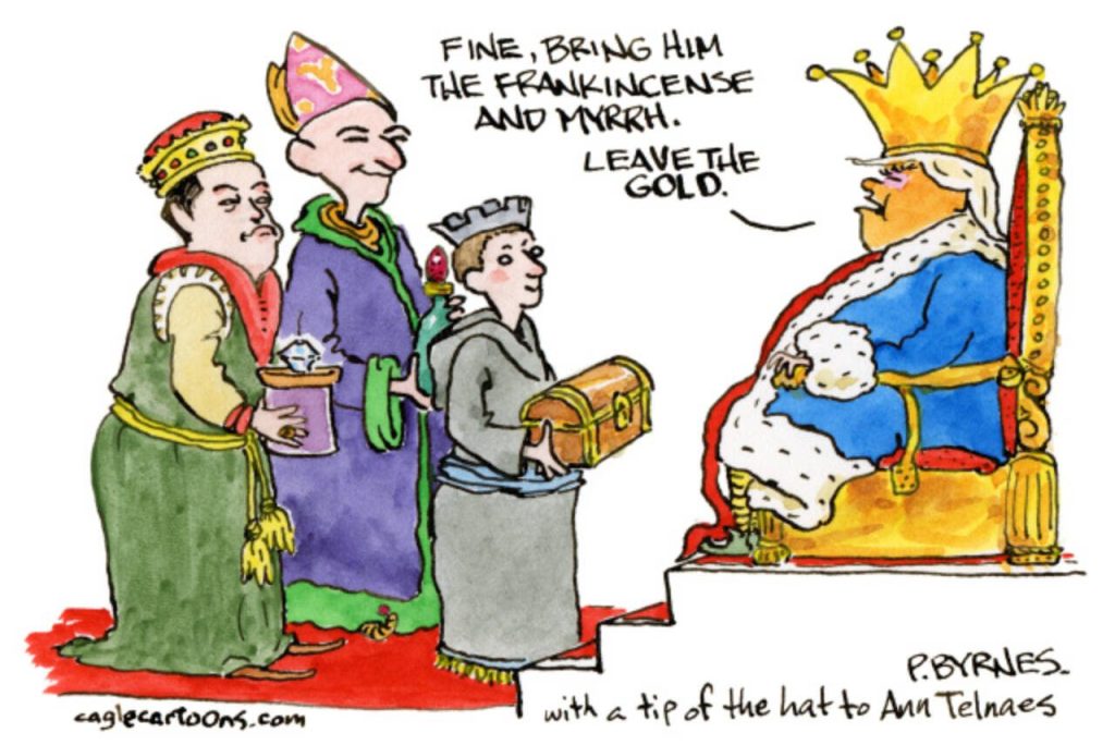 That iciness may now be spreading from the owners to the editors of leading newspapers. This weekend, Pulitzer-prize winning editorial cartoonist Ann Telnaes resigned after some 16 years at the Post — Motto: Democracy Dies in Darkness — after one of her cartoons was rejected by its opinions editor, David Shipley.