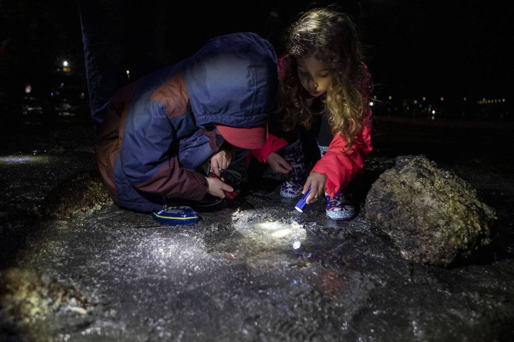 “There’s so many more crabs out at night, and a lot of the other animals oftentimes feel a little more comfortable,” Beach Watchers coordinator Jonathan Robinson said. “Fish are more likely to be in the tide pools. Spot shrimp have glowing eyes, so you can see them way better at night, which is really cool.”