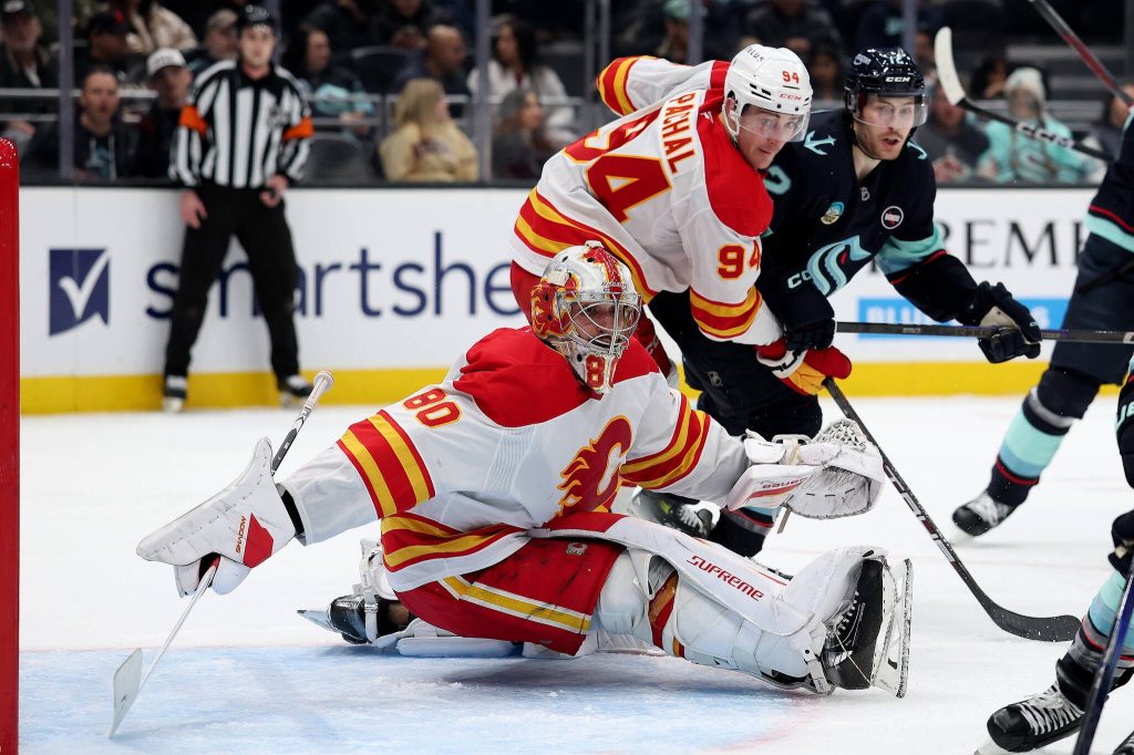 Seattle gave up the first official goal to Morgan Frost, then winger Jared McCann took issue with a legal hit on teammate Andre Burakovsky between the benches. McCann dived on top of Calgary defenseman Brayden Pachal, then went off to the penalty boxes to ice his knuckles. His double minor for roughing had convoluted consequences.