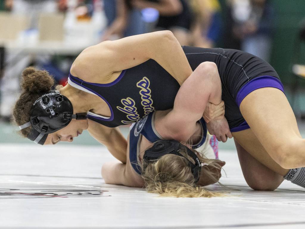 100–Alyse Gudde (Arlington) pinned Belyini Pascascio-Umana (Mariner) :47; 105–Cameron Erdmann (Glacier Peak) pinned Payton Tyson (Cascade) :37; 110–Kamryn Mason (Lake Stevens) pinned Kyla Brown (A) :37; 115–Araxi Crew (A) pinned Lexie Oliver (LS) 3:00; 120–Halle Boyland (LS) pinned Jacqueline Moran-Gonzalez (C) :44, 125–Ki Burgess (Kamiak) pinned Jaymari O’Neal (A) 3:03; 130–Lily Ganal (LS) pinned Eliana Shreve (GP) 2:58; 135–Eden Cole (K) dec. Brooke Vandehey (GP) 2-1; 140–Kylee Wicklund (LS) pinned Jannethzy Cortes-Hernandez (M) :49; 145–Emily Ortiz Marquez (Jackson) tech. fall Marisa Denke (GP) 2:51; 155–Alex Harris (LS) pinned Afebia Aemere (LS) 1:30; 170–Dallas Kautz (LS) pinned Samantha Wilner (GP) 1:41; 190–Milana Garcia (M) pinned Nadha Vemmerath-Kulangara (C) :20; 235–Airianna Gilbraith (M) pinned Katie Wheeler (A) 1:58.