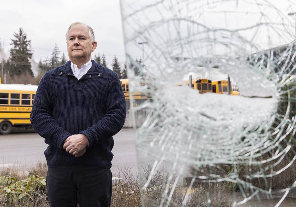 Northshore School District bus driver Stewart O’Leary pictured next to his bus’s shattered driver’s side windshield on Friday, Feb. 14, 2025 in Bothell, Washington. (Olivia Vanni / The Herald)